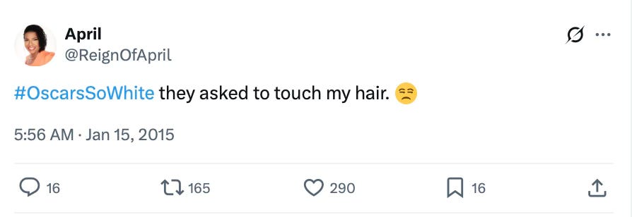 What we all believed back then, or the low-hanging fruit of the time, was that they all had to be racists. Even if deep down we knew they weren’t. They were the Good Liberals, after all, who voted for Obama. But it wasn’t enough. There had to be representation of people of color, and April Reign made it now a much bigger story, one that publicly humiliated the ruling elite who wanted to project goodness, then and now.