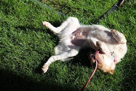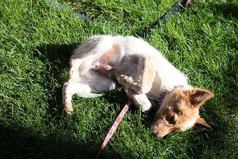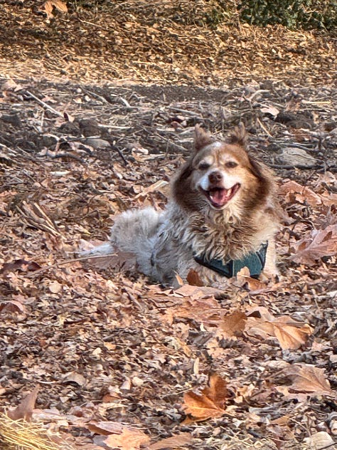 I always thought he felt the call to the wild, but had to spend his days on a leash, and how boring that must be. He often lies down several times during even our shorter walks. He needs to rest. I can barely think of life without him. He goes with me everywhere, along with my other dog, Luna.