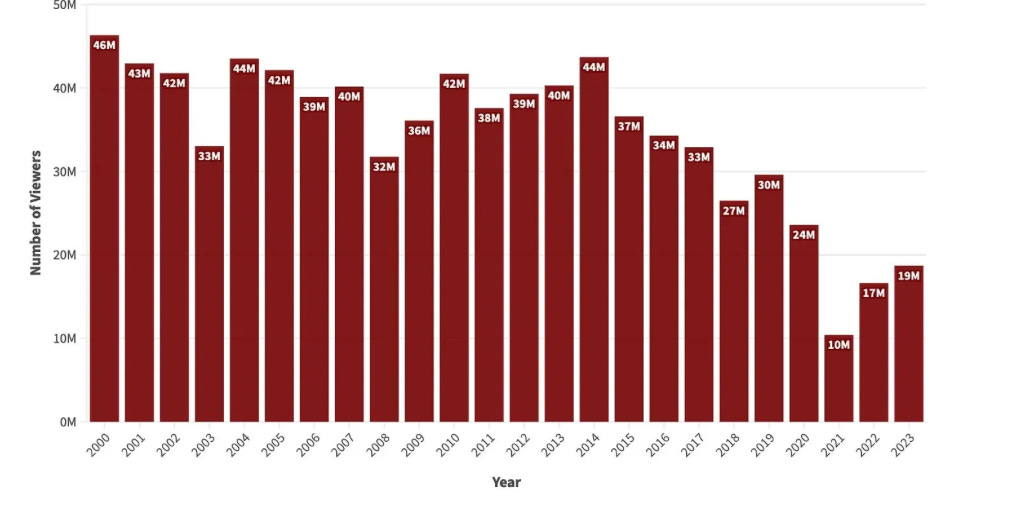 The ratings back in 2015, for the Oscar year of 2014, were pretty good. They hadn’t yet utterly and completely collapsed like they would later. Probably, this was the first year they began to steadily decline to 37 million. They were just 19 million this past year.
