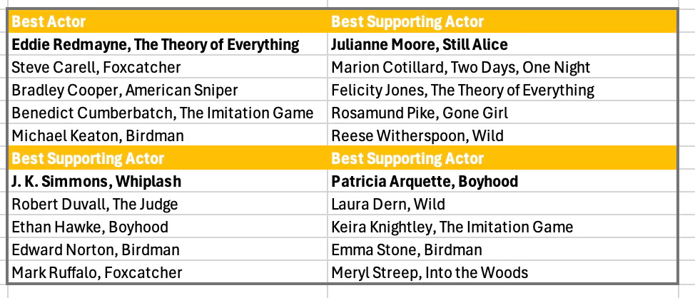 Some people kept clinging to the idea that Richard Linklater might win Director or Boyhood might win Picture, but no. The race was over by the time we got to the PGA. Patricia Arquette would be the sole winner for Boyhood, Best Supporting Actress.